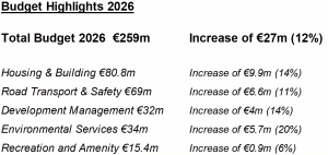 Meath County Council has adopted the budget for 2026, which provides for expenditure of over €258 million on local public services, an increase of over €26 million (or 11.5%) on the 2025 budget. Councillors voted to adopt the annual budget for 2026 at a meeting on Monday, 24 November, and it is the first time the Council’s budget has exceeded €250 million.